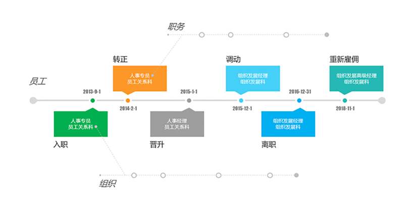 通过业务流、 信息流两种方式, 可将基础人事信息与继任、 绩效等人才数据进行关联与集成, 实现查看员工详情、 调动、 晋升、 试用期转正、变更职务、 变更主管、 修改工作信息、 离职等一体化管理。